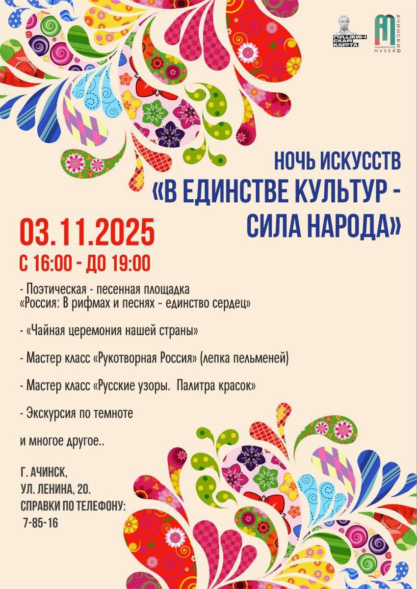 🎨 Ночь искусств в Ачинском краеведческом музее! 🗓 3 ноября 2025 года ⏰ с 16:00 до 19:00 📍 Ачинск, ул. Ленина, 20 и 20а ✨ Тема: «В единстве культур — сила народа!» Вас ждёт вечер творчества, традиций и вдохновения 🇷🇺 🧡 В программе: • Поэтическо-песенная площадка «Россия: в рифмах и песнях — единство сердец» • Чайная церемония нашей страны ☕ • Мастер-классы: – «Рукотворная Россия» (лепка пельменей) 🥟 – «Русские узоры. Палитра красок» 🎨 • Площадка «Головные уборы народов России» • Настольные игры народов России • Экскурсии «История города», «По темноте» и интерактивная «Путь к Победе» • Фотозона, буфет и многое другое! 🎤 В финале — «Свободный микрофон» и вручение благодарственных писем. Приходите всей семьёй — ощутите атмосферу единства и творчества! 💫 📞 Подробности по телефону: 7-85-16 #КрайВысокойКультуры #АчинскийКраеведческийМузей #ночьискусств2025