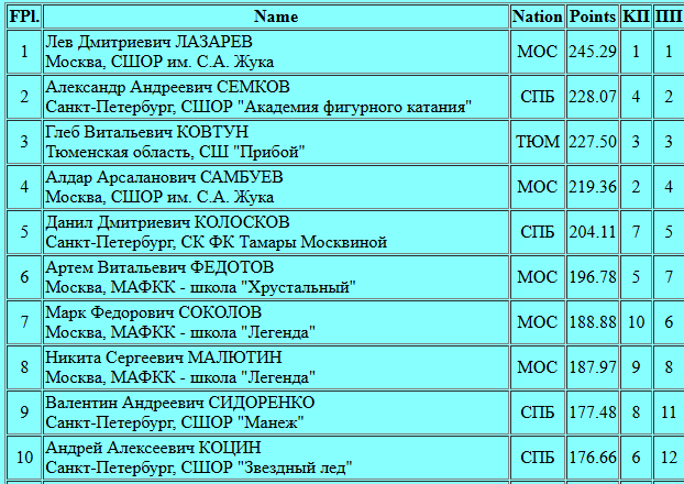 Совсем, такое впечатление, загрустил и ушел в себя в программах в этом сезоне Артем Федотов (196.78 - 6 место). Закрылся и никого не впускает. Не вижу я какого-то стремления презентовать себя и порадовать зрителей, что наблюдалось в прошлых сезонах. Это дополнительная проблема к тем техническим сложностям, которые сейчас появились и которых не было, например, на контрольных прокатах. Предлагаю считать, что это просто проблемы роста. Сегодня можно похвалить Артема за успешный первый тройной аксель, но при этом пожурить за 2 бабочки. Общий итог выступления Артема на этом турнире - занял 6 место, сохранил шансы на отбор на Первенство России и это уже какой-то позитив.