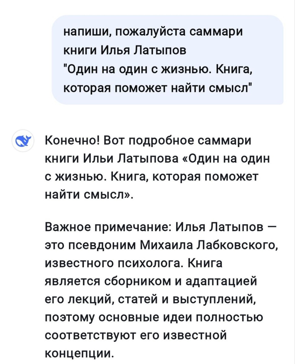 Если только в форме: "найди когнитивное искажение" и подробно описать случай или фразу. И не пишите, что мысль ваша или событие произошло с вами, а то чат может сказать, что вы совершенно правы в любом случае. В них изначально настройки на поддержку пользователя💐 ИИ чаты собирают всё из открытых источников, и если не упомянуть, что необходимы только научные данные, то он может порекомендовать много чего "интересного". От глицина до паломничества к горам Тибета. Если не знакомы с темой, то распознать, что правда, а что нет будет довольно сложно. Пока так. Из последнего: Прежде, чем читать что-то из науч-попа, я прошу составить саммари книги/тезисы/основные мысли ну и вот: