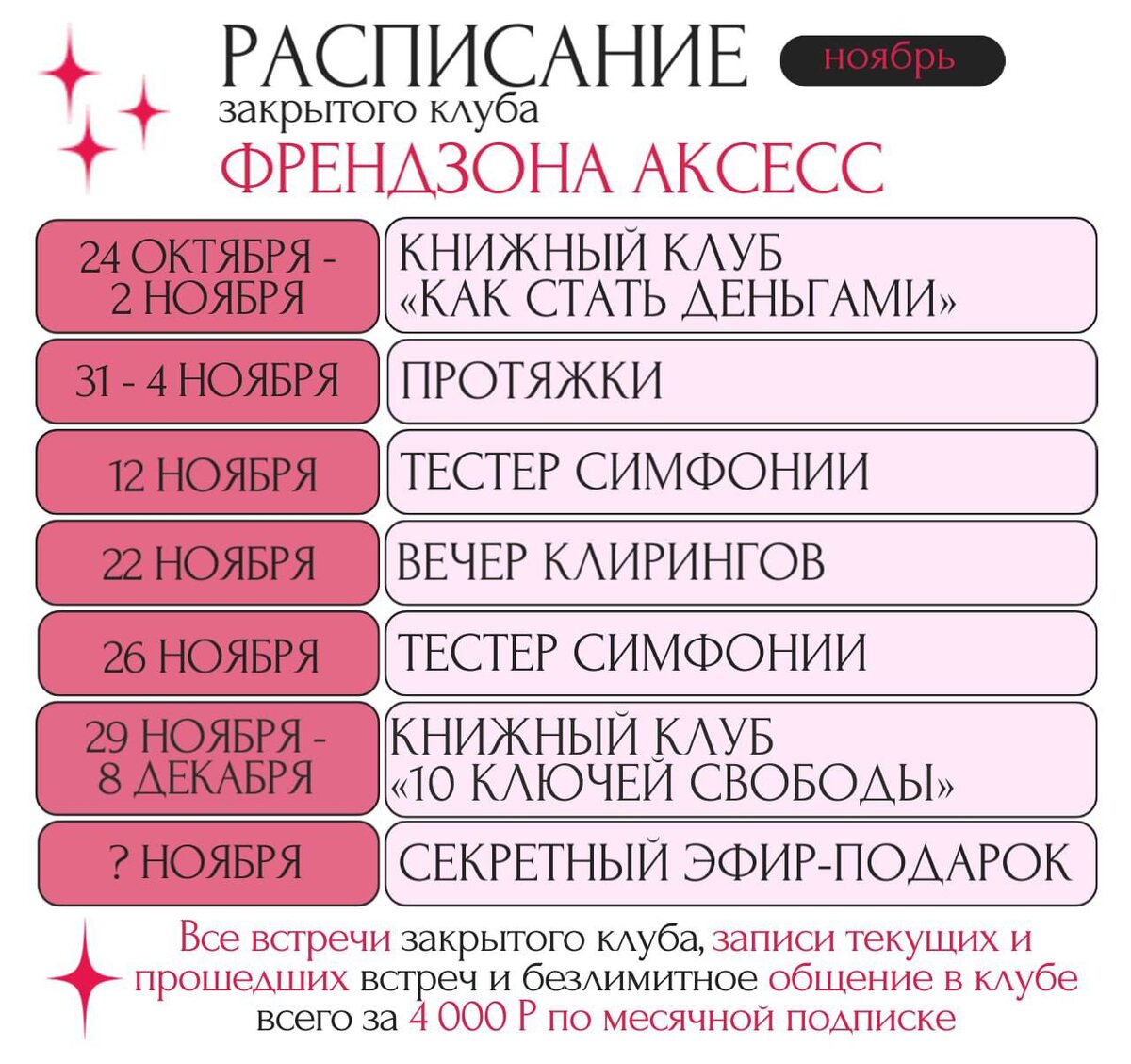 В НОЯБРЕ в закрытом клубе «Френдзона Аксесс» 👫 Великолепие тестеров симфоний, энергетических протяжек, вечеров клирингов и книжных клубов, а также: ✨ КИНОклубы ✨ ДЕНЕЖНЫЕ протяжки ✨ расширяющие ЭФИРЫ ✨ ПОДКАСТЫ ACCESS ME ✨ЧАТ друзей 👉Вступить в закрытый клуб ФРЕНДЗОНА по подписке👫: • 1 месяц - 4 ООО₽ • 3 месяца - 1О ООО₽ • 6 месяцев - 17 ООО₽ Больше информации о классах с Татьяной - @cf_tatiana Больше информации о Татьяне на сайте - https://fedorova-access.ru