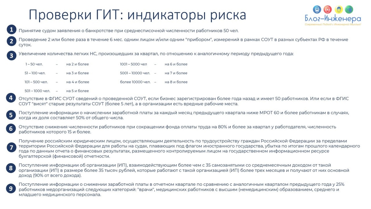 Проверки ГИТ: срок действия индикаторов риска продлят год ℹ️ Соответствующий проект приказа Минтруда размещён для общественного обсуждения на портале проектов НПА на срок до 13 ноября 2025 года. Им внесут изменения в часть вторую приказа Минтруда России от 30.11.2021 № 838н «Об утверждении перечня индикаторов риска нарушения обязательных требований при осуществлении федерального государственного контроля (надзора) за соблюдением трудового законодательства и иных нормативных правовых актов, содержащих нормы трудового права». Срок действия индикаторов риска, которые могут указывать на нарушение работодателями обязательных требований, предложили продлить до 31 декабря 2026 года. Пока он ограничен 31 декабря 2025 года. Перечень индикаторов риска используют при решении вопросов о проведении внеплановой проверки работодателя и выборе её вида. Он состоит из 9 пунктов (см. карточку). Блог—Инженера для людей ❤️ ⭐️ СУОТ 📍 Услуги