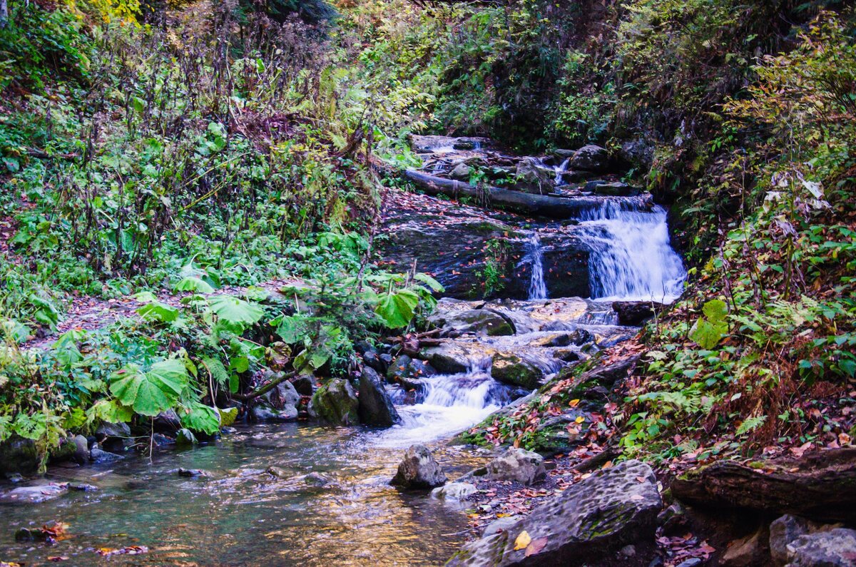 Тропа к водопадам Менделихи Если немного прогуляться от Розы Пик до канатной дороги Эдельвейс, и спуститься на ней вниз, то можете оказаться у самой границы с Абхазией. Здесь можно прогуляться и посмотреть на красивые водопады реки Менделиха. К Дмитрию Менделееву название не имеет никакого отношения, как и к основателю учения о наследственности генетику Грегору Менделю. Легенда гласит, что староста этих мест Борис Мендель, заметил как военные перевозили золотые монеты. Мендель это заметил, за что поплатился жизнью. Так офицер посчитал, что дед расскажет об увиденном и их ограбят разбойники. Убийство произошло недалеко от речки, которая и получила название Менделиха. Вернусь к парку водопадов «Менделиха». Парк находится на южном склоне хребта Аибга на высоте 1470 м. В парке 7 водопадов, и он условно поделен на три маршрута: Малое, Среднее и Большое кольцо. Среднее и Большое кольцо закрыты для посещения до следующего года. Малое кольцо ведет вверх от нижней станции канатной дороги,