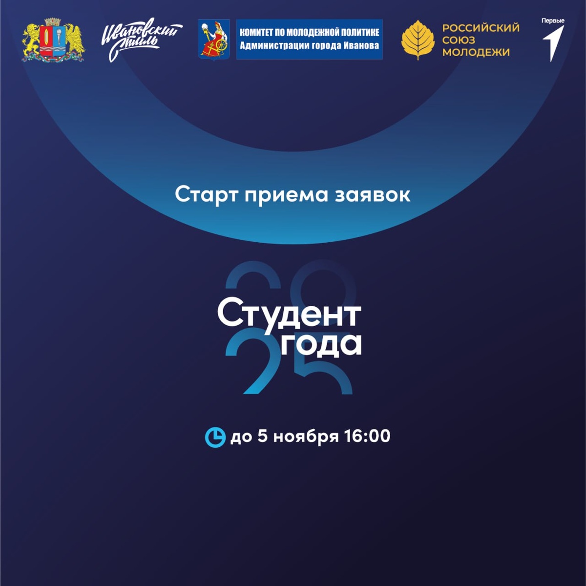 Премия «Студент года – 2025» Администрация г. Иванова объявляет о приеме заявок на участие в региональном этапе Российской национальной премии «Студент года». Кто может стать номинантом Премии - студенты (курсанты), обучающиеся по очной форме обучения, осваивающие образовательные программы высшего образования (программы бакалавриата, программы специалитета, программы магистратуры) в возрасте от 18 до 25 лет (для иностранных студентов – до 27 лет) Номинации - «Председатель совета обучающихся года» - «Общественник года» - «Интеллект года» - «Иностранный студент года» - «Творческая личность года» - «Спортсмен года» - «Доброволец года» - «Медиа года» - «Патриот года» - «Добровольческое объединение года» - «Студенческое медиа года» - «Патриотическое объединение года» - «Студенческое научное общество года» - «Спортивный (в том числе «киберспортивный») клуб года» - «Творческий клуб года»