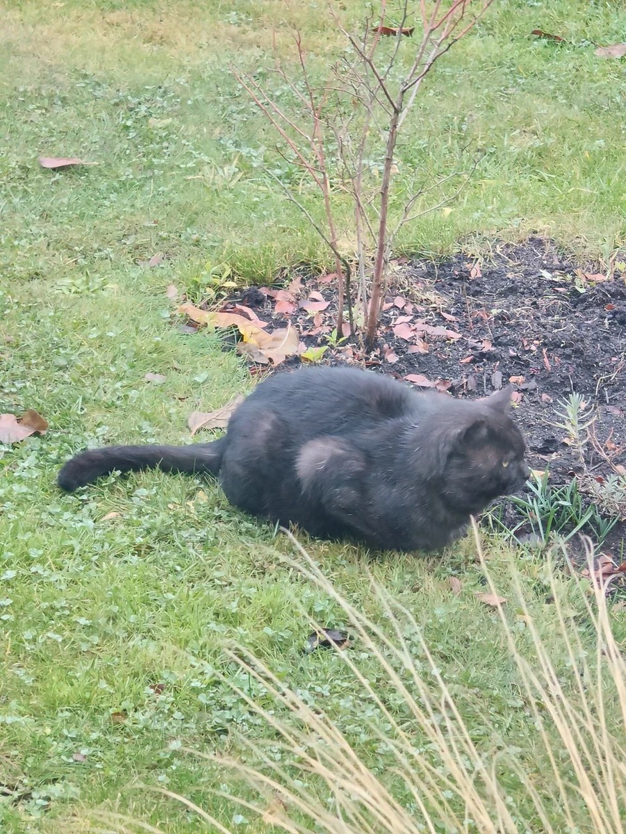 Утренняя котожопа внимательно смотрит на синичек, которые опрометчиво считают, что корм в домике не только для котиков