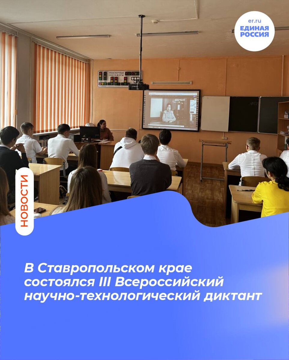 В Ставропольском крае состоялся III Всероссийский научно-технологический диктант Он прошёл при поддержке федерального партпроекта «Единой России» «Выбирай своё» Очными площадками проведения диктанта стали Буденновский политехнический колледж, Невинномысский химико-технологический колледж и Северо-Кавказский федеральный университет. Свыше 200 студентов и активистов партии проверили свои знания об инженерных разработках и технологиях, позволивших достичь победы в Великой Отечественной войне. Тема диктанта этого года – «Технологии победы». Участникам предстояло ответить на 25 вопросов о вкладе инженеров и учёных в достижения Великой Отечественной войны. Темы охватывают медицину, связь, разведку, инженерные решения и информационные технологии. По итогам написания диктанта будет сформирован единый рейтинг по всем участникам (в зачёт пойдёт количество правильных ответов и время прохождения теста). Лучшие получат сертификаты о подтверждении своего технологического интеллекта. Победителей