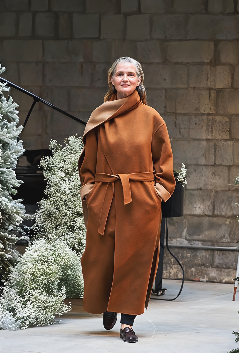 Драпированные пальто — это классика, что вернулась с акцентом на комфорт, как в осенних коллекциях 2025. Свободный крой из шерсти с кашемировой нитью мягко обволакивает, скрывая мелкие неровности и защищая от ветра — выглядит дорого, но дышит, идеально для наших переменчивых дней.
