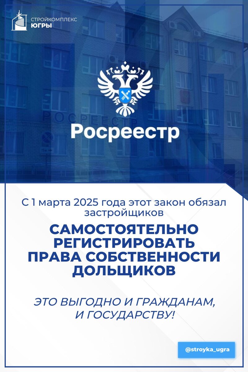 Застройщики Югры регистрируют права дольщиков: быстрее, проще, прозрачнее! 📃 Новый закон ускоряет оформление жилья и помогает своевременно пополнять региональный бюджет. Управление Росреестра по Югре провело рабочую встречу с представителями застройщиков региона и УФНС, чтобы обсудить исполнение Федерального закона № 487-ФЗ. С 1 марта 2025 года этот закон обязал застройщиков самостоятельно регистрировать права собственности дольщиков. 🔑 Нововведение кардинально упростило жизнь покупателям квартир в новостройках. Дольщику больше не нужно тратить время на сбор документов и посещение МФЦ. За него всё делает застройщик. Государство преследует и свой интерес, устраняя риск, что дольщик будет откладывать регистрацию, оставаясь незащищенным в течение долгого времени. А своевременная регистрация позволяет УФНС корректно начислять налог на имущество, что напрямую влияет на наполнение бюджета. 🗓️ На практике это работает так: после передачи объекта дольщику, застройщик обязан в течени