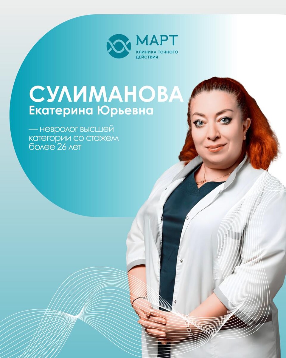 Лечение боли — специализация клиники МАРТ! Мы знаем, насколько важно найти причину боли и подобрать эффективную терапию, поэтому в нашей команде работают только опытные профессионалы. Рады сообщить, что с ноября в клинике начинает приём новый врач: • Сулиманова Екатерина Юрьевна — невролог высшей категории, рефлексотерапевт, специалист по плазмолифтингу и ботулинотерапии со стажем более 26 лет. Специализация врача включает: - Головные боли и головокружения - Нарушения сна и астенические состояния - Боли в шее, спине и конечностях, онемение, радикулиты - Последствия инсультов, травм и операций - Фибромиалгию - Нарушения работы мочевого пузыря из-за проблем с нервной системой - Полинейропатии различного происхождения. Если боль мешает вам жить полноценно — доверьте своё здоровье профессионалам! Записаться на консультацию можно по телефону +7 (812) 309-96-65 или на сайте: https://martclinic.ru/nevrolog