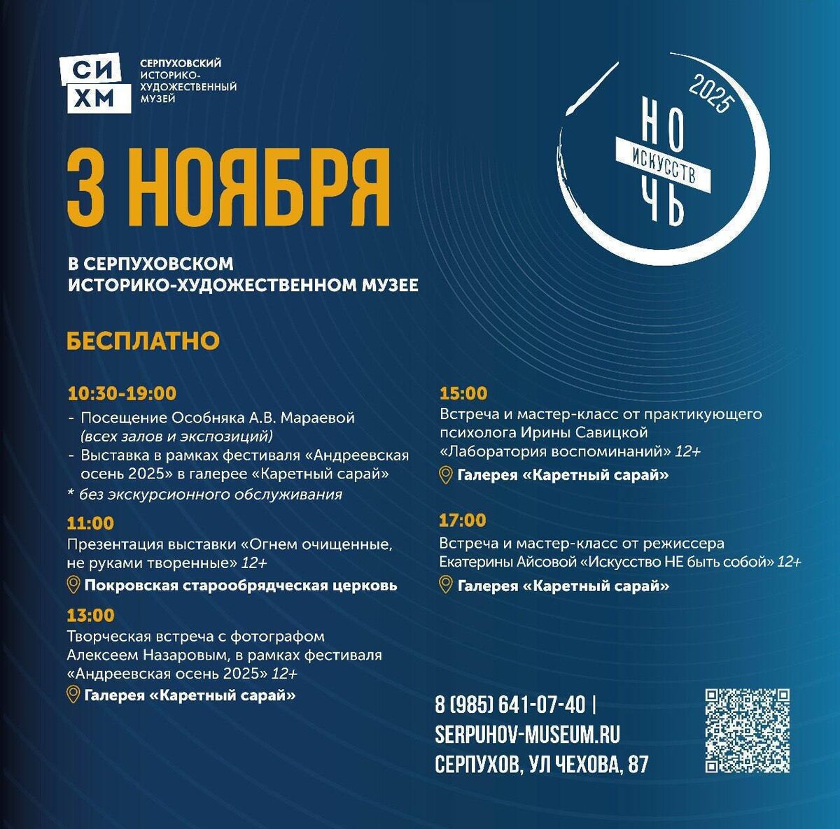Ночь Искусств в Серпуховском музее! ✨ 3 ноября Серпуховский историко-художественный музей приглашает всех на Ночь Искусств 2025! В этот день вас ждет насыщенная программа, полная интересных встреч и впечатлений, и все это – абсолютно бесплатно! 🍂В программе: • 10:30-19:00 - Посещение Особняка А.В. Мараевой (все залы и экспозиции), включая выставку в рамках фестиваля «Андреевская осень 2025» в галерее «Каретный сарай». • 11:00 - Презентация выставки «Огнем очищенные, не руками творенные» в Покровской старообрядческой церкви (12+). • 13:00 - Творческая встреча с фотографом Алексеем Назаровым в галерее «Каретный сарай» в рамках фестиваля «Андреевская осень 2025» (12+). • 15:00 - Встреча и мастер-класс от практикующего психолога Ирины Савицкой «Лаборатория воспоминаний» (12+). Место уточняется. • 17:00 - Встреча и мастер-класс от режиссера Екатерины Айсовой «Искусство НЕ быть собой» (12+). Место уточняется. 🍂Не упустите возможность окунуться в мир искусства и творчества!