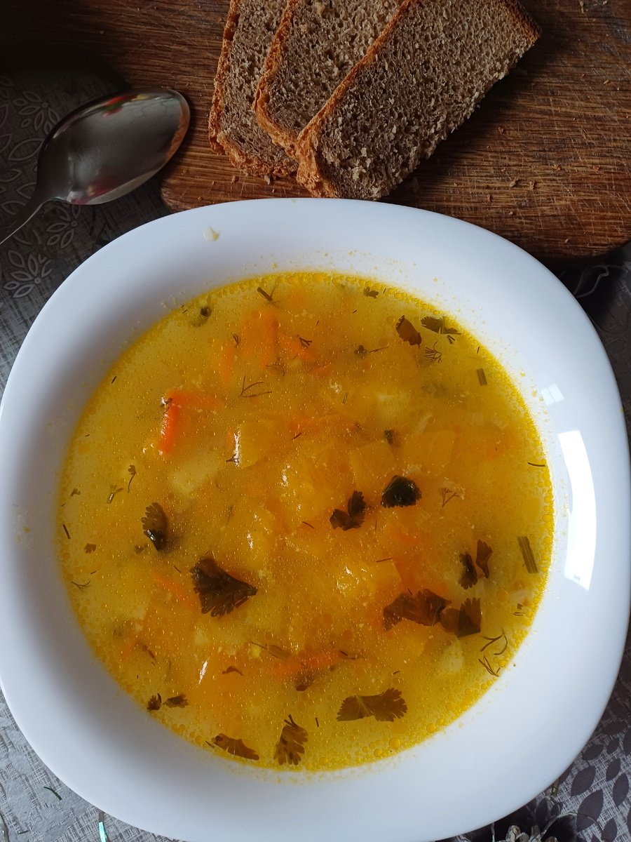 Состав на кастрюлю 3 литра: Тыква ~ 300 гр. Картофель 4-5 небольшие, Лук - 1 средняя, Морковь -1 средняя, Пшено 1/3 стакана, Соль - 2 ч.л., Зелень - небольшой пучочек на выбор (укроп, петрушка, кинза) Когда хочется чего-то сезонного и простого. Легкий быстрый и по осеннему красивый супчик из обычных продуктов, котрый может приготовить каждая женщина. 1. Поставить кастрюлю наполовину заполненную водой на плиту. Пшено промыть и опустить в воду. 2. Тем временем, почистить лук, морковку и выложить на сковородку. Обжарить в небольшом количестве постного масла на среднем огне до золотистого цвета. Накрыть крышкой. Или поставить на маленький огонь, накрыть крышкой, периодически помешивая. 3. Пока готовиться пережарка, начистить картошку, нарезать кубиками и опустить в кастрюлю с пшеном. Когда вода закипит опустить примерно 300-400 грамм тыквы. У меня это нарезанные кубиками заготовки из морозилки. 4. Варить примерно 20 минут на среднем огне, опустить пережарку из моркови и лука. Долит