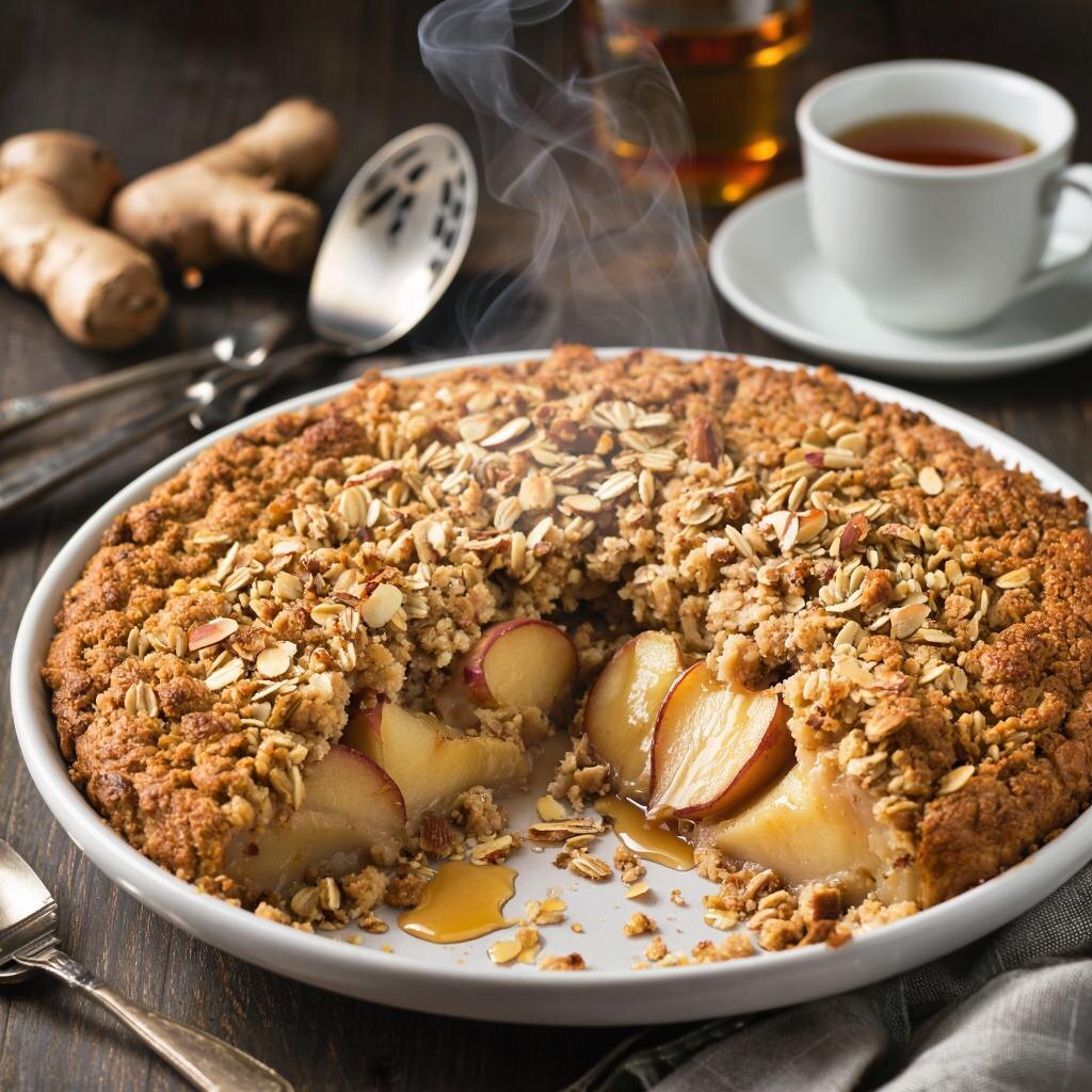 Вообще, грушево-имбирный крамбл — это не только вкусное, но и полезное лакомство. Десерт крамбл появился в Великобритании много веков назад и на сегодняшний день является одной из любимейших вкусняшек англичан. Давайте разберемся, почему этот десерт заслуживает внимания не только с точки зрения традиционных пристрастий жителей Туманного Альбиона, но и с точки зрения здоровья. 1. Груши — источник витаминов и клетчатки Не для кого не секрет, что груши богаты витаминами C и K, а также содержат значительное количество клетчатки. Клетчатка способствует улучшению пищеварения, помогает поддерживать здоровый уровень сахара в крови и снижает уровень холестерина. Витамин C укрепляет иммунную систему, а витамин K важен для здоровья костей и свертываемости крови. 2. Имбирь — природный антиоксидант Имбирь известен своими противовоспалительными и антиоксидантными свойствами. Он помогает бороться с воспалениями, улучшает кровообращение и может облегчить симптомы простуды и гриппа. Имбирь та