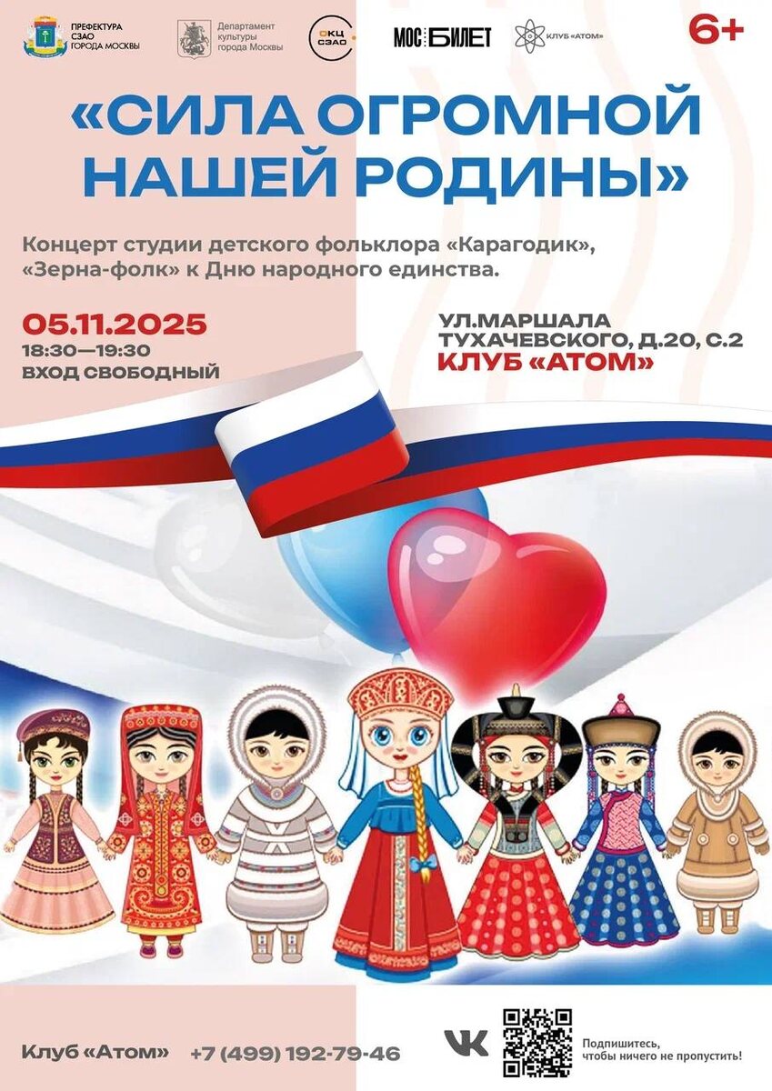 🎶 Концерт студии детского фольклора «Карагодик» и коллектива «Зерна-фолк» 🇷🇺 «Сила огромной нашей Родины» 📅 5 ноября 2025 года 🕕 18:30–19:30 📍 Клуб «Атом» ул. Маршала Тухачевского, д. 20, стр. 2 ГБУ г. Москвы «ОКЦ СЗАО» 🎟 Вход свободный | 👧 6+ ✨ В честь Дня народного единства вас ждет трогательное музыкальное путешествие по бесценной народной памяти России. В программе: 🎵 глубокие традиционные напевы 🎻 звучание народных инструментов 🎤 современные аранжировки и живые выступления ансамблей 👫 вокальные дуэты студии «Карагодик» и коллектива «Зерна-фолк» Этот концерт — не просто музыка, а послание о единстве, дружбе и гордости за богатое культурное наследие нашей страны. 🇷🇺 🔗 Регистрация: bilet.mos.ru/event/360612257 📞 +7 (499) 192-79-46 #концерт #фольклор #Карагодик #ЗернаФолк #ОКЦСЗАО #ХорошевоМневники #КлубАтом #ДеньНародногоЕдинства #культураМосквы #СЗАО #бесплатно #детскоеТворчество #Россия #народнаяМузыка