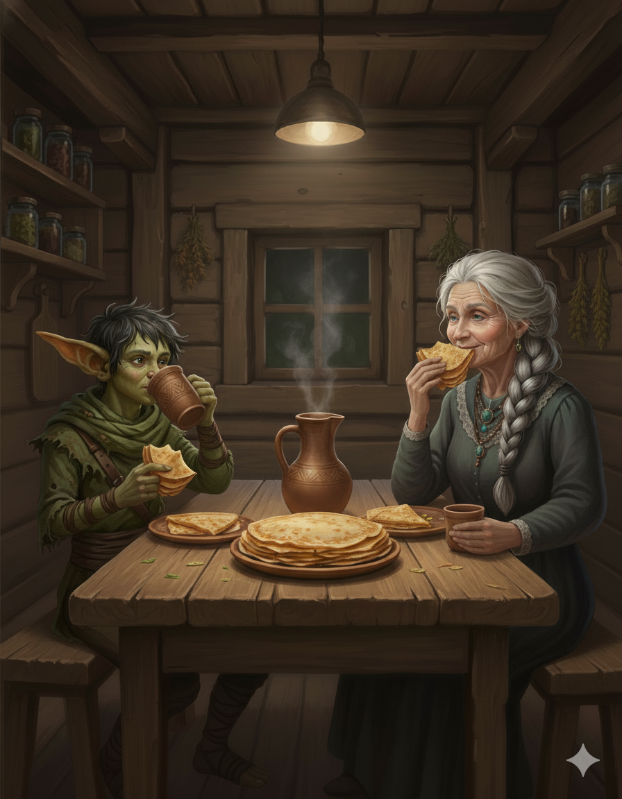 Сегодня она напекла румяных блинов, тонких и ароматных, а в печи уже томится черничный пирог. По избе разносится тёплый, уютный запах теста и мёда. На дубовом столе стоит глиняный кувшин с травяным отваром, в котором сплелись ароматы зверобоя, мяты, липового цвета и чабреца. Дом её стоит на курьих ножках, но сейчас спокойно опустился на землю, приглашая дорогого гостя. Южель знает: здесь его ждёт не только угощение, но и беседа по душам. Баба Яга – старая ведунья – всегда умела найти нужные слова, унять тревоги, дать совет, который не сразу понимаешь, но потом осознаёшь его мудрость. Как только Южель приблизился, дверь избы со скрипом отворилась, и на пороге появилась Баба Яга. Баба Яга — статная женщина с седыми кудрями, заплетёнными в свободную косу. Её ясные, проницательные глаза смотрят с мудростью прожитых веков, а на губах часто играет хитроватая улыбка. Её движения плавны и уверены, словно у той, кто знает все тайны леса и жизни. Она оглядела его испытующим взглядом, но вскоре