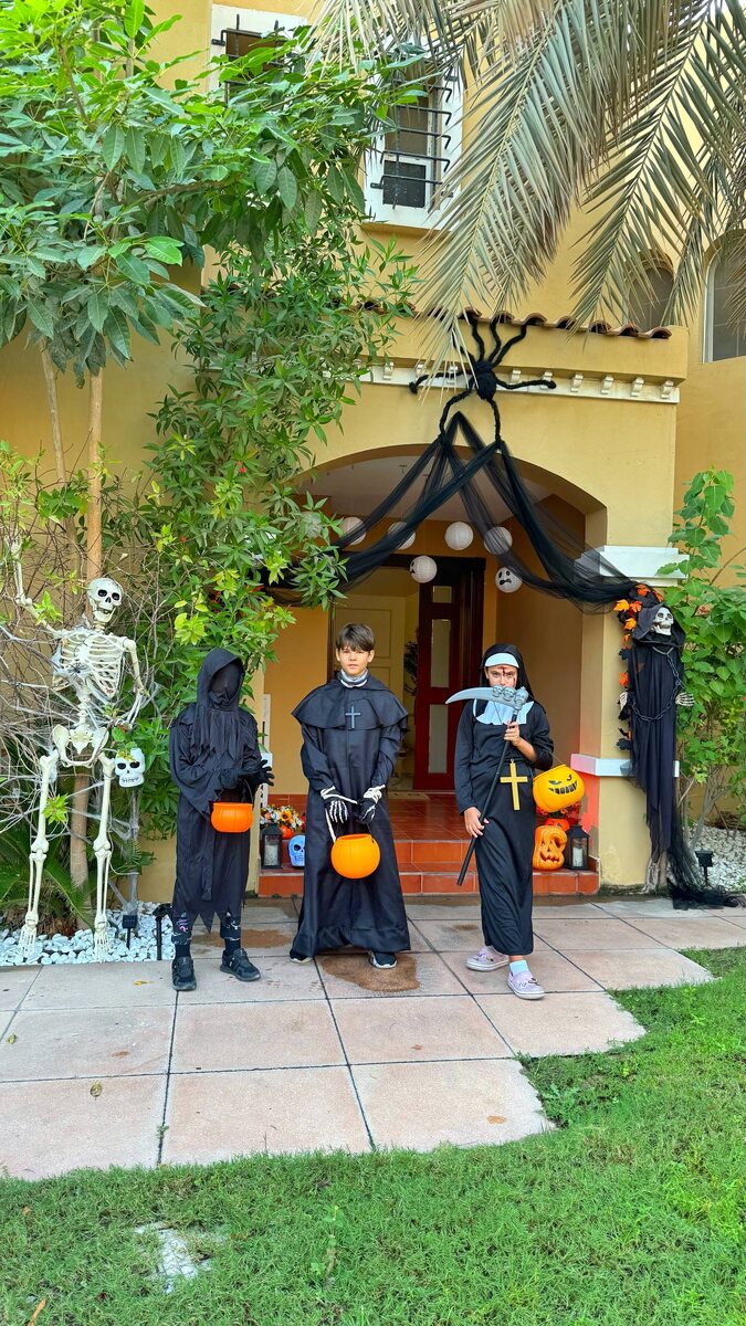 Trick or treat Или по-нашему, «гадость или сладость» — выбирай, если кто-то стучится в дверь. Делюсь, как мы отметили Halloween в нашей дубайской деревеньке. К нам в комьюнити приезжают гости погулять посмотреть это «шоу», так как далеко не везде в ОАЭ почему-то так украшают дома и проводят вечер. К нам за конфетами заявились скелеты, Марио с Луиджи, Уэнсдей с её фирменной косой, Гарри Поттер с метлой наперевес, пара зомби, лесная нимфа, которая шла под ручку с охотником за привидениями, и целая процессия мертвых невест. Навстречу им появилась София. Та самая, что покинула монастырь. Ангелы в шоке, а вампиры в очередь за селфи. Миша, мой сын, вышел в образе пророка с маской черепа и посохом. Оливия выехала на карете в костюме тыквы. И друзья подтянулись всей компанией, в костюмах, от безымянных до жнецов. Я же нарядил лицо в образ красноглазого.. Здесь праздник любят по-настоящему. Украсил дом, жди гостей. Соседи соревнуются, кто страшнее оформит участок. Говорят, отгоняет злых дух