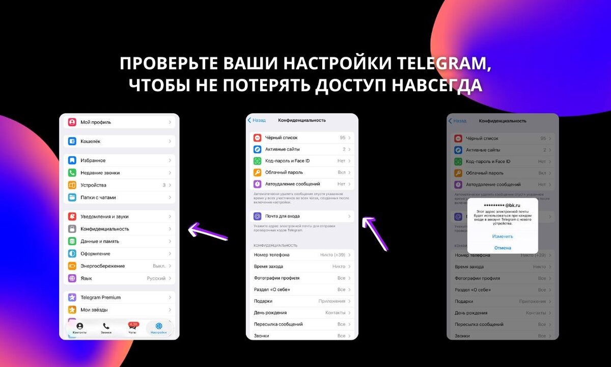 ⚠️ Не потеряйте доступ к Telegram Из-за блокировки SMS и звонков от Telegram пользователи не получают коды входа. Если выйдете из аккаунта – можете потерять его навсегда. 📩 Чтобы сохранить доступ: зайдите в Настройки → Конфиденциальность → Почта для входа и добавьте e-mail. Сделайте это сейчас – потом может быть поздно.