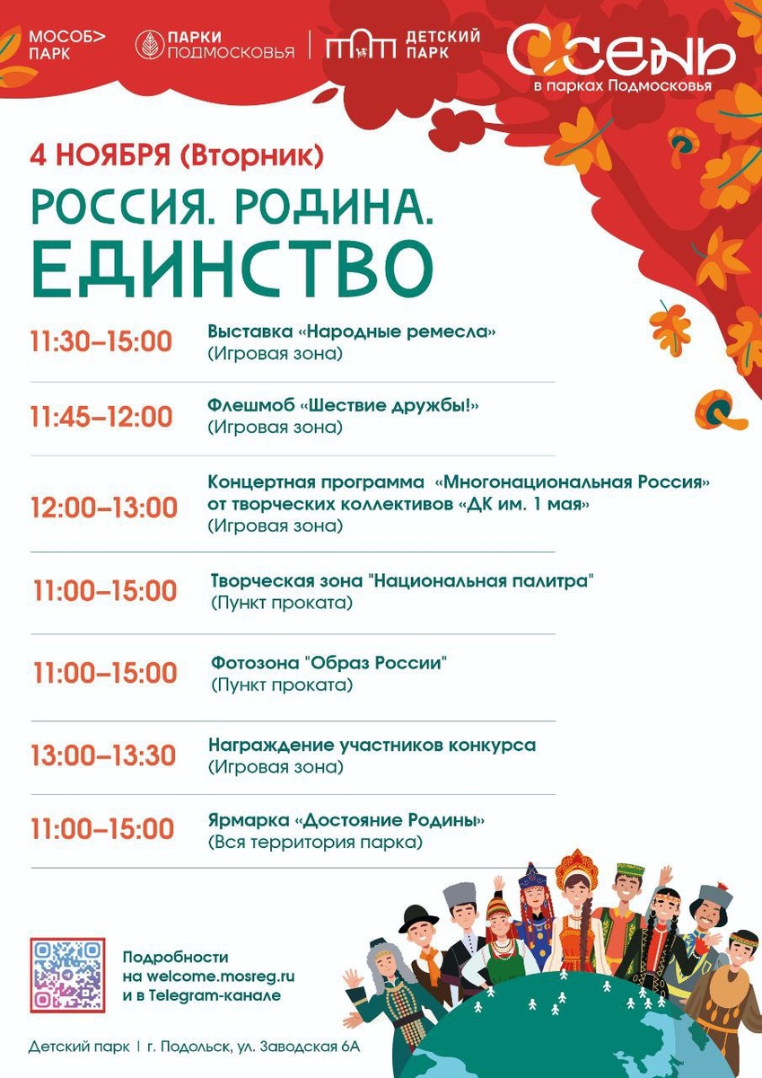 ✨ 4 ноября в Детском парке 🖼 11.30 - 15.00 Выставка "Народные ремёсла" 👫11.45 - 12.00 Флешмоб "Шествие дружбы!" 🎉 12.00 - 13.00 Концертная программа "Многонациональная Россия" 🪆 11.00 - 15.00 Творческая зона "Национальная палитра" 📸 11.00 - 15.00 Фотозона "Образ России" 🛍 11.00 - 15.00 Ярмарка "Достояние Родины" 🚫 Возраст: 0+ 📆 04.11.2025 🏢 Детский парк культуры и отдыха 📍 г. Подольск, мкр. Климовск, ул. Заводская, 6а 💰 Вход свободный❗️ ⭐Поддержать канал голосом 💰 Вакансия - курьер в Подольске ✅ Мероприятия Подольск https://dzen.ru/id/66ed500f7b5671493eca3fd6 http://vk.com/podolsk_events http://dzen.ru/podolsk_events