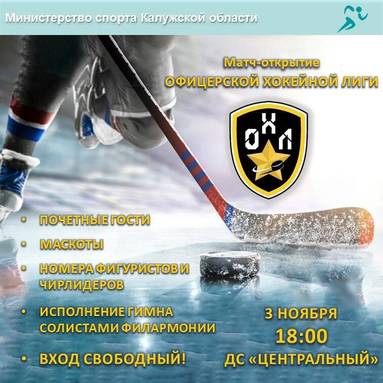 ⚡Стали известны подробности открытия ОХЛ! Уже 03 ноября во Дворце спорта «Центральный» стартует Офицерская хоккейная лига. Это новая страница развития хоккея в Калужской области! В 18.00 на льду «Центрального» сойдутся команды «Росгвардия» и «Госслужащие». ✅На лед выйдут два заместителя губернатора области Александр Шляпников и Дмитрий Разумовский и министр спорта области Олег Сердюков. ✅Почетный гость праздника - заслуженный тренер СССР, заслуженный тренер РСФСР Игорь Тузик. ✅ Атмосферу праздника создадут творческие номера от фигуристов и чирлидеров. ✅Гимн РФ в живую исполнят солисты Калужской филармонии. Приходите всей семьёй насладиться атмосферой единения в преддверии Дня народного единства, зарядиться позитивом и энергией от драйва спортивных состязаний. ❗Вход бесплатный, ждём всех болельщиков и любителей спорта!