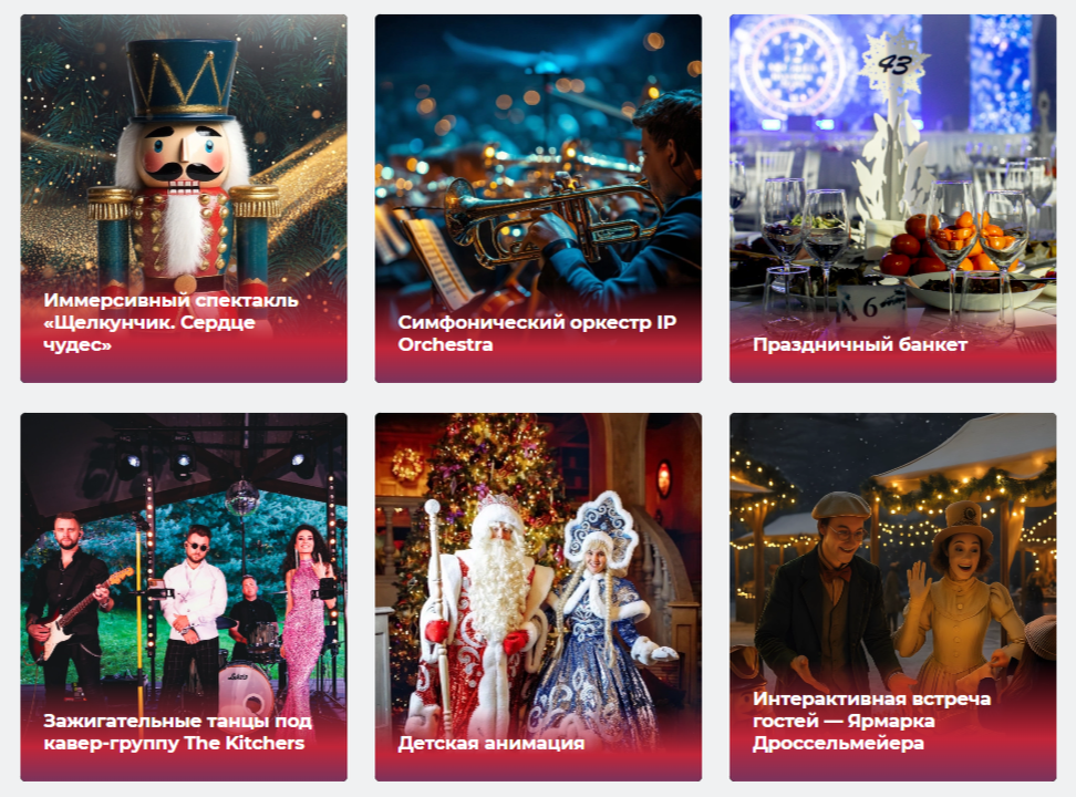 - Программа: новогодний банкет с шоу-программой в Ледовом Дворце (гастрономический иммерсивный спектакль "Щелкунчик. Сердце чудес"), симфонический оркестр IP Orchestra, музыкальные вечера в ресторане, поздравление Деда Мороза и Снегурочки, первоянварский бранч, анимационные программы для детей.
