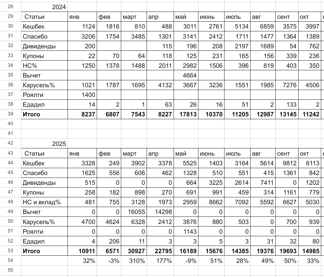 Конечно, в октябре пассивный доход стал Мега важным, потому что активного было мало 😏😁 и ведь не потому, что я, не работала, а просто потому что на новой работе в октябре получила только маленькую зп за несколько дней сентября и аванс за первые 2 недели октября. И сумма общая, конечно, раза в 2 меньше получилась, чем до этого активный доход за месяц. В такие моменты особенно понимаешь важность пассивного дохода, который зависит лишь от размера уже имеющихся денег на любых счетах. Будь то под проценты или же под траты, чтобы получить кешбек, который я тоже записываю в пассивный доход. Пока ноябрь стартовал, и от него я конечно, жду выравнивания по активному доходу - по крайней мере, столько, чтобы баланс оставался, несмотря на траты, положительным 😏 За октябрь совокупно 14985 р. На 33% больше, чем в октябре прошлого года. Конечно, всё ещё вытягивают общую сумму проценты на накопительных счетах (хотя суммы и уменьшились в связи с тратами в сентябре и октябре), но 5000 руб всё равно