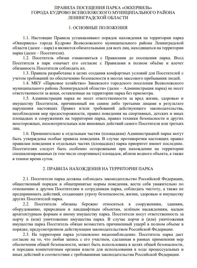 "Белое не надевать, обтягивающее не носить": администрация Заневского поселения утвердила Правила посещения парка Оккервиль Правила устанавливают порядок нахождения на территории парка «Оккервиль» города Кудрово и являются обязательными для всех лиц, находящихся на территории парка. Согласно Правилам каждый посетитель парка обязан ознакомиться с Правилами до посещения парка. Вход Посетителя в парк означает его согласие с Правилами в полном объёме и влечет обязанность Посетителя соблюдать их. Посетителям парка запрещается: 🟥Въезжать на территорию парка на любых видах мото- и автотранспорта. 🟥Заходить на территорию служебных зданий (сооружений), помещений, площадок и иных объектов в парке, закрытых для Посетителей, а также на территорию, которая временно или постоянно огорожена от доступа Посетителей, а также обозначена запрещающими знаками или табличками. 🟥Курить на территории парка, а также находиться на территории парка в состоянии алкогольного и/или наркотического опьянения. 🟥