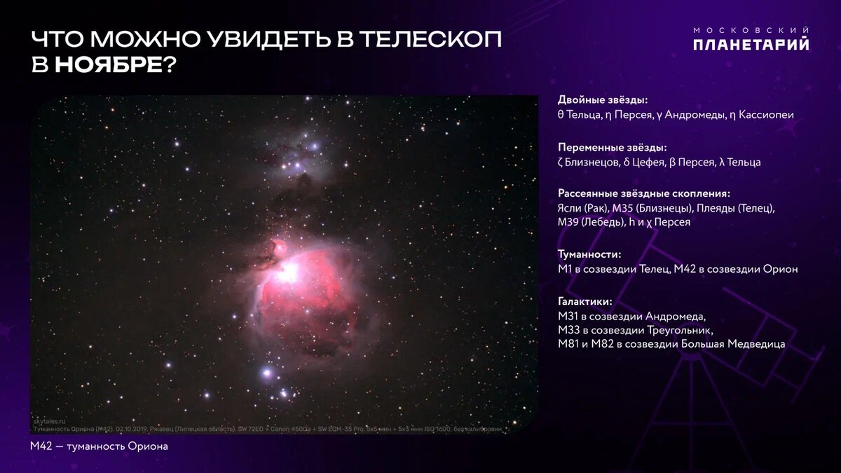 двойные звезды: θ Тельца, η Персея, γ Андромеды, η Кассиопеи; переменные звезды: ζ Близнецов, δ Цефея, β Персея, λ Тельца; рассеянные звездные скопления: Ясли (Рак), M35 (Близнецы), Плеяды (Телец), M39 (Лебедь), h и χ Персея; туманности: М1 в созвездии Телец, М42 в созвездии Орион; галактики: М31 в созвездии Андромеда, М33 в созвездии Треугольник, М81 и М82 в созвездии Большая Медведица. Читать полный текст статьи — https://clck.ru/3Q3DS8