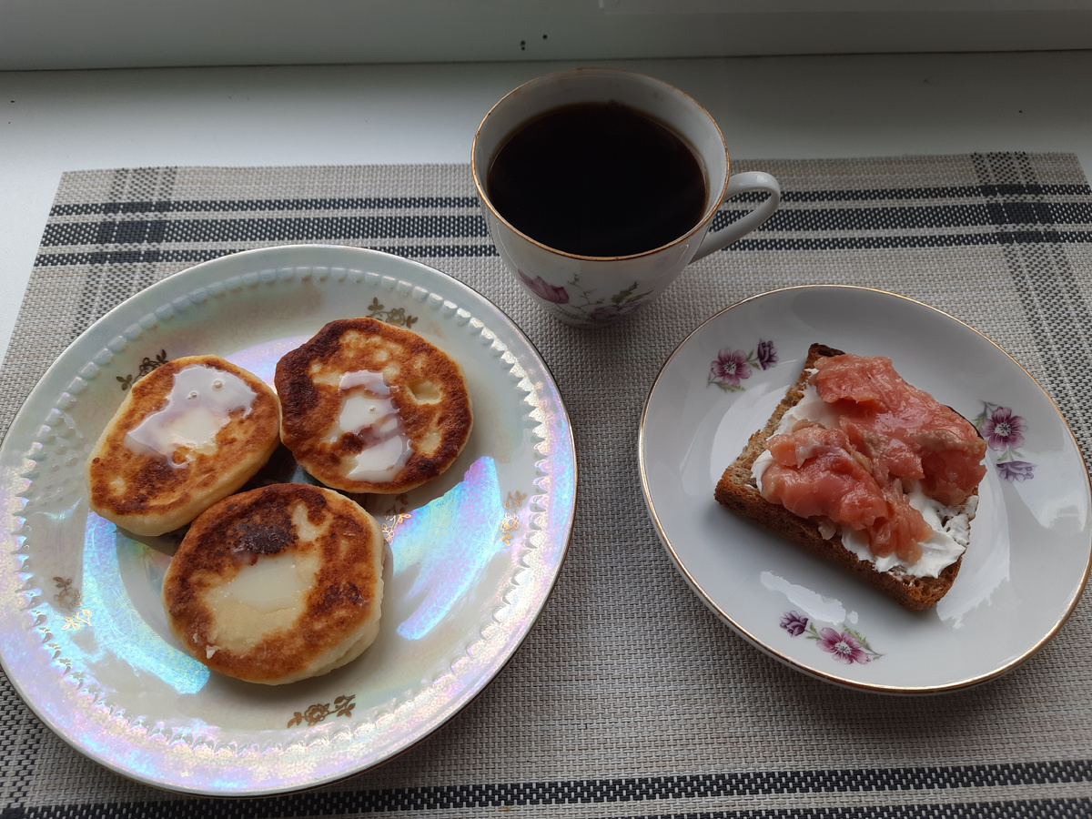 Сметана у нас закончилась, поэтому пришлось сырники есть со сгущёнкой).
