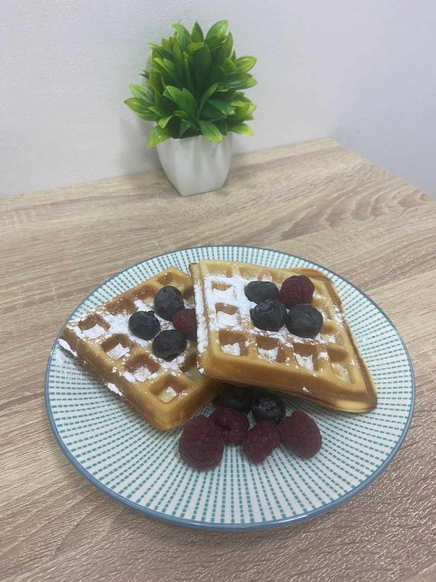 Вафельная симфония — золотистая бельгийская вафля, подаётся с карамельным соусом, свежими ягодами и хрустящими орешками