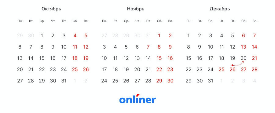 До конца года осталось ровно два месяца — и большие выходные будут в каждом из них. Ближайшие — уже на следующей неделе. Напоминаем, как именно мы будем отдыхать и придется ли за этот отдых «расплачиваться» рабочими днями. На следующей неделе будет три выходных подряд — с пятницы по воскресенье: 7, 8 и 9 ноября. Седьмое ноября в Беларуси является официальным выходным, отрабатывать его в другой день не нужно. В декабре выходные будут длиннее — четыре дня подряд: с 25 по 28 декабря. Правда, перед этим предстоит поработать шесть дней — рабочая пятница 26 декабря переносится на субботу 20 декабря. Канун Нового года — 31 декабря — официальным выходным, кстати, не является, а вот 2026 год начнется сразу с четырех выходных — с 1 по 4 января. Есть о чем рассказать? Пишите в наш телеграм-бот. Это анонимно и быстро