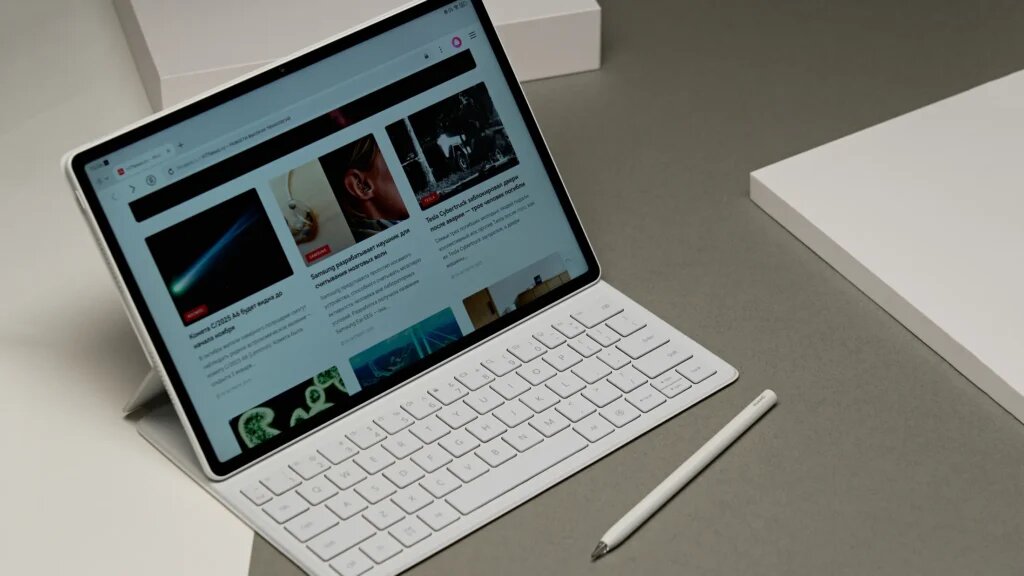 Комплектный чехол-клавиатура превращает планшет почти в ноутбук. Толщина при этом вырастает до 13 мм, но планшет ощущается всё равно компактно. Клавиши почти полноразмерные, ход — 1,5 мм, печатать удобно. Подключение происходит по NearLink.