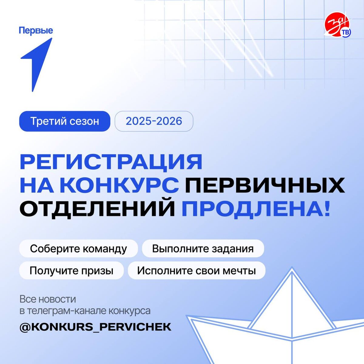 ❤️ Движение Первых продлевает сроки участия в Конкурсе первичных отделений. Движение Первых сообщает о продлении сроков регистрации и выполнения заданий в Конкурсе первичных отделений. Такое решение принято по многочисленным просьбам участников, чтобы каждая команда успела подготовиться и представить свои достижения. Обновлённые сроки: — до 23 ноября — формирование команд и заполнение анкет в номинациях «Лига возможностей» и «Первая лига»; — до 5 ноября — приём заявок в творческой номинации «Первичка в деле!». Конкурс направлен на поддержку инициативности и вовлечённости активистов Движения Первых по всей стране. Он даёт возможность обменяться опытом, продемонстрировать результаты совместной работы и попасть в рейтинг лучших первичных отделений России. Подать заявку можно по ссылке. ♥️Смотрите За!ТВ в Telegram и ВК
