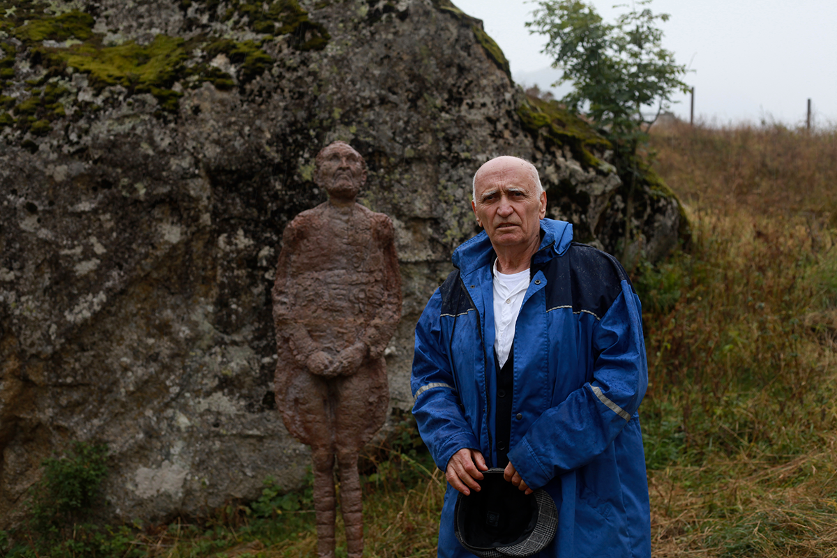 Высокогорное селение Ногкау в Северной Осетии, буквально — новое село, затеряно между троп и туманов. Здесь уже почти никто не живет, и тем более удивительно оказалось видеть, как на фоне скал вдруг выросли 25 скульптур из бронзы и дерева. Вот бабушка — какой в Осетии помнит каждый свою — неспешно идет за водой.