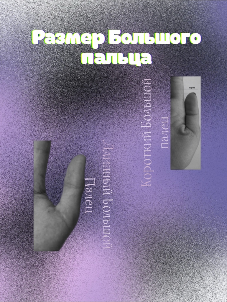 Размер большого пальца – это основной показатель врожденного уровня энергетики человека. ✅Большой палец считается нормальным по длине в том случае, если окончание его первой фаланги достигает примерно середины третьей фаланги указательного пальца, ✅Если палец ниже этой отметки, то он считается коротким, за исключением случая, когда палец расположен слишком низко и он сам по себе нормальной длины. Помимо этого большой палец может выглядеть длинным за счет высокой посадки на руке. 📌Длину пальца можно определить также с помощью мизинца, для чего нужно приложить большой палец нижним суставом в углубление, которое находится чуть ниже места прикрепления пальца Меркурия. Если большой палец и палец Меркурия примерно одинаковой длины, то большой палец считается нормальным. 🖇️При визуальном определении размера большого пальца всегда следует помнить о посадке пальца. 🟢Длинный Большой палец,который превышает середину третьей фаланги пальца Юпитера- принадлежат людям с незаурядной проб