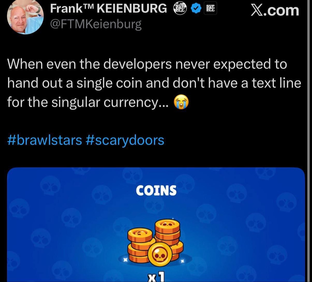 ⚡️ Фрэнк не ожидал такого Разработчики не ожидали, что придется раздавать 1 монету, у них не было даже такого текста для магазина. Аккуратный намек от гейм-лидера на отсутствие разума невнимательность комьюнити, выбираем с умом. ✅Новости по Clash Royale - ТЫК ✅Новости по Телеграмм подаркам, NFT - ТЫК Мир Supercell. Подписаться