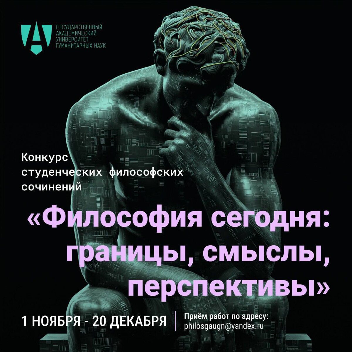 Конкурс ко Всемирному дню философии! ☑️ Философский факультет ГАУГН объявляет конкурс философских сочинений на тему «Философия сегодня: границы, смыслы, перспективы», приуроченный ко Всемирному дню философии. К участию приглашаются студенты бакалавриата и магистратуры высших учебных заведений России. Представляемая работа должна соответствовать следующим требованиям: 📍 текст в форме эссе (или научной статьи), написанный на русском языке; 📍 содержание работы должно соответствовать теме Конкурса; 📍 работа должна представлять собой самостоятельное и оригинальное рассуждение; 📍 объем – до 20.000 знаков с учетом пробелов. Вместе с сочинением должна быть представлена информация об авторе (ФИО участника, дата и место рождения, место учебы с указанием курса, адрес электронной почты). 📆 Прием конкурсных работ осуществляется в срок до 20 декабря. Призерам и победителя будут вручены специальные грамоты, а их работы рекомендованы к публикации в научном журнале ГАУГН «Nauka.me».