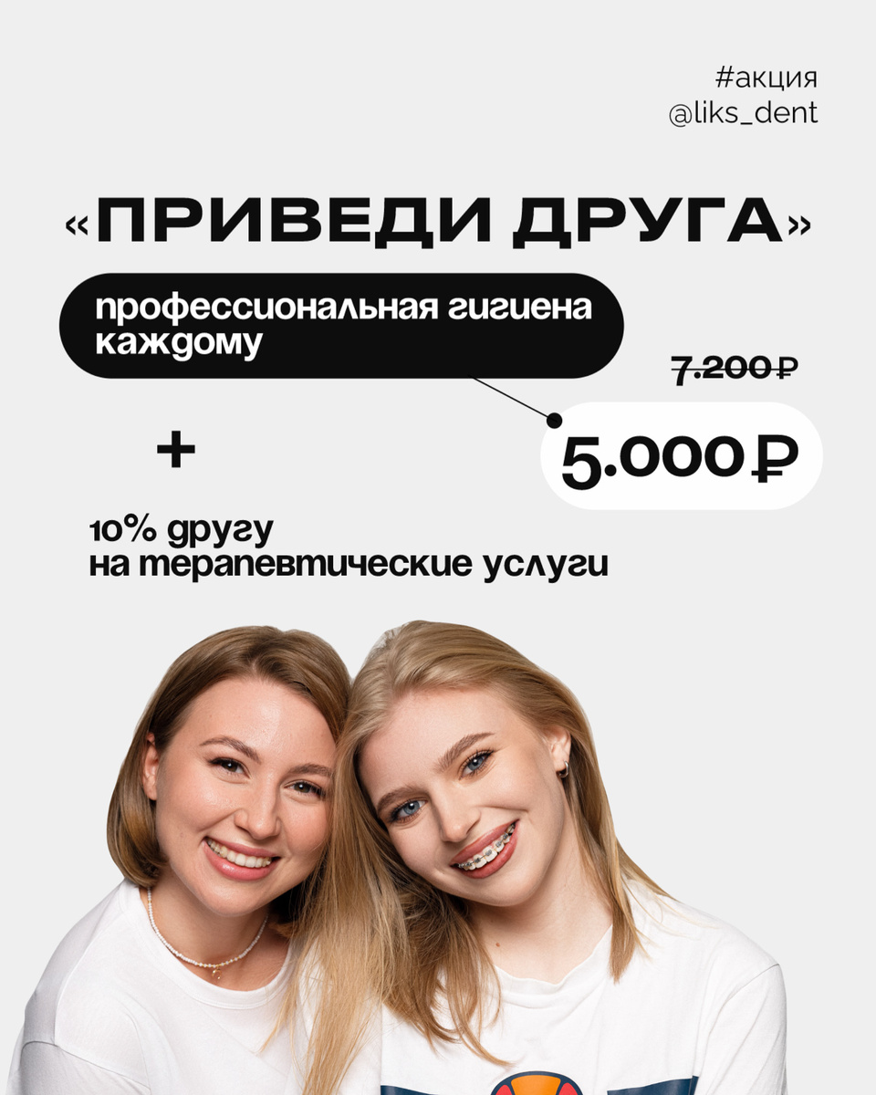 Нам безумно приятно, когда вы советуете нашу стоматологию своим друзьям и близким, поэтому мы решили сделать вам подарок в честь этого 🥹 Теперь вы можете привести своего друга в Ликс Дент и получить бонус себе и другу! 👉🏻 Вы приводите друга на услуги (он должен сказать администратору, что от вас) 👉🏻 Вы получите за это скидку на профессиональную гигиену полости рта за 5.000₽ (вместо 7.200₽) 👉🏻 Друг также получает скидку на профессиональную гигиену полости рта за 5.000₽ (вместо 7.200₽) + 10% скидку на терапевтические услуги 📌 скидка на терапевтические услуги действует 3 месяца *акция действует с 1 ноября по 31 января