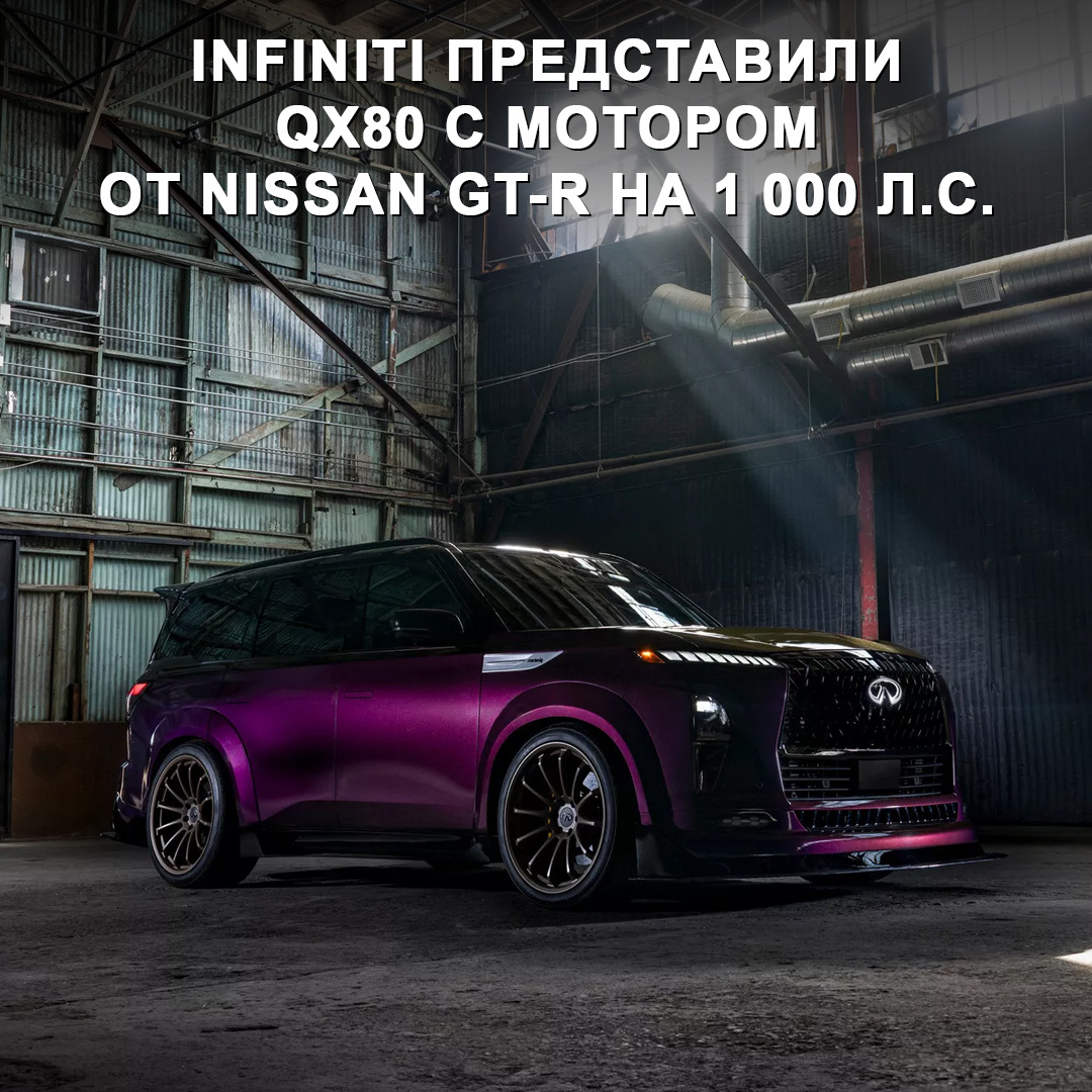Но этого им показалось мало, и они прокачали мотор до 1 000 л.с. 😎 Необычный проект подготовлен командой инженеров бренда для выставки тюнинга SEMA. Список доработок: — 3,8-литровый мотор V6 VR38DETT c двойным турбонаддувом, которому добавили более производительную топливную систему и охлаждение, усиленные турбины, а также выхлоп от GT-R. — Специальная винтовая подвеска с пружинами Eibach ERS. — Модернизированная рулевая рейка. — Электронная блокировка заднего дифференциала. — Широкий аэродинамический обвес с карбоновыми элементами и плёнка Midnight Purple на кузове. — Колёсные диски 24” и покрышки Yokohama Parada Spec-X. — Карбон-керамические тормоза. По словам руководителя американского отделения Infiniti, они всерьёз подумывают создать спортивный QX80 для серийного производства. Но будет ли у него мотор от GT-R — пока загадка. Как думаете, интересный конкурент заряженного Гелика? 🤔 #дромновость #сша #infiniti #qx80 #gtr