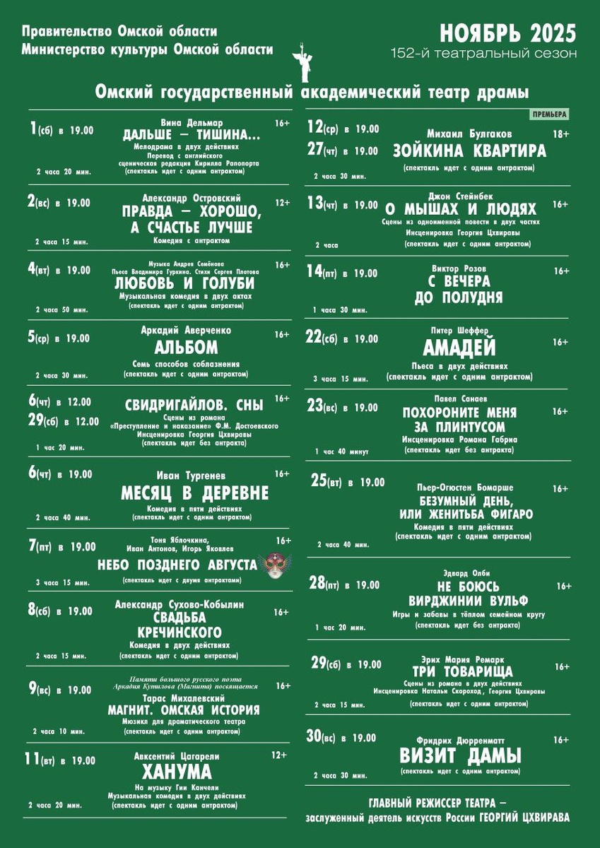 Дорогие друзья! Третий месяц осени вступил в свои права! Пусть вас не расстраивает хмурое небо, ведь провести уютные вечера за просмотром спектакля вас приглашает Омский академический театр драмы! Еще раз публикуем для вас афишу на ноябрь. Сохраняйте ее себе, чтобы не потерять, и выбирайте постановки на свой вкус! Билеты на спектакли ноября в кассе театра и на сайте omskdrama.ru. Все спектакли участвуют в программе "Пушкинская карта". До встречи! #омскдрама152
