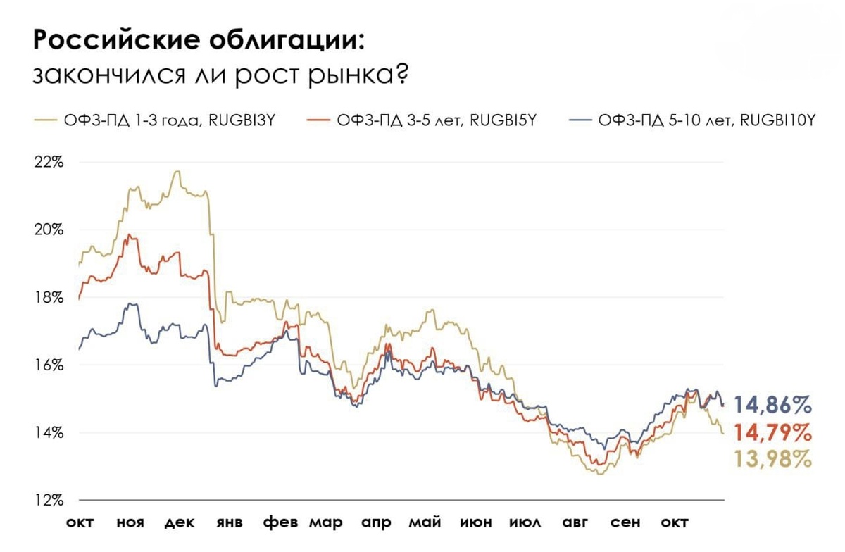 ➰ Что происходит на рынке облигаций: покупать нельзя продавать? Российский рынок облигаций находится в переломной точке цикла денежно-кредитной политики. Год назад, в конце октября 2024 года, ключевая ставка достигла своего максимума в текущем монетарном цикле. 🕯 Доходности облигаций: До начала сентября рынок находился в активной фазе снижения ставок, но Банк России пересмотрел вверх свой прогноз по инфляции и ключевой ставке — период жесткой денежно-кредитной политики, вероятно, окажется более продолжительным. За это время доходности выросли в среднем на 78 базисных пунктов по всей кривой. 💬 [RGBI] Государственные облигации — 14,70% годовых (+78 б.п.) 💬 [RUCBNS] Корпоративные облигации — 16,70% годовых (+108 б.п.; спред — 272 б.п. к ОФЗ 1-3 года) 📈 Ключевые тренды российского долгового рынка: 1️⃣ Цикл смягчения денежно-кредитной политики продолжается, но темпы замедлились из-за сохранения инфляционных рисков, которые продолжат сдерживать темпы снижения ключевой ставки в бли