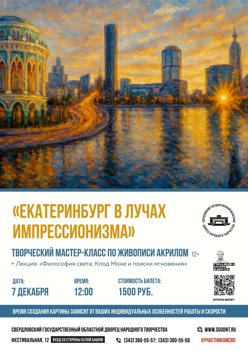 🎨 Мастер-класс по живописи акрилом «Екатеринбург в лучах импрессионизма» Когда привычный город становится похож на картину Моне — всё дело в свете и цвете. 📅 7 декабря 💳 Стоимость участия — 1500 рублей (Доступно по Пушкинской карте) 🎟 Билеты: vk.cc/cQTGxY Импрессионизм научил видеть красоту мгновения — игру света, движение, атмосферу. В лекционной части участники познакомятся с творчеством Клода Моне и узнают, как он передавал настроение вместо точных форм. 🖌 Затем эти принципы оживут на холсте: участники создадут городской пейзаж «Екатеринбург в лучах импрессионизма», попробуют короткий мазок, работу с цветом и светом. 👩🎨 Пошаговый разбор и помощь педагога сделают процесс понятным всем, а готовую картину можно забрать с собой. 🇷🇺 Проект проходит в рамках программы бесплатного доступа на культурные события для участников СВО и их семей: vk.cc/cNbv4i