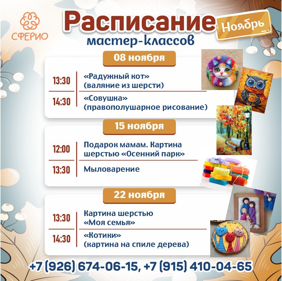 ✨ 💥МАСТЕР-КЛАССЫ В НОЯБРЕ💥 🔥 Приглашаем детей и взрослых на наши творческие мастер-классы в ноябре. С нами вы научитесь чему-то новому и получите массу положительных эмоций. Сделайте подарок себе или близким🤗 🏢 Учебный центр "Сферио" 📍 г. Чехов,ул. Полиграфистов, 6 (Вход со двора, подъезд 2, этаж 3) 🔗 Записаться: https://wa.me/+79154100465 Наши соцсети 📲⬇️ ➡️ ВК https://vk.com/sferio_kids ➡️ ТГ https://dzen.ru/id/672e115c65592e5989376c34 ➡️ Продленка https://vk.com/prodlenkachehov ➡️ Школа https://vk.com/sferio_school ⭐Поддержать канал голосом ✅ Мероприятия Чехов https://dzen.ru/id/66cc4b48e9ef144699238a51 http://vk.com/chekhov_events http://dzen.ru/chekhov_events