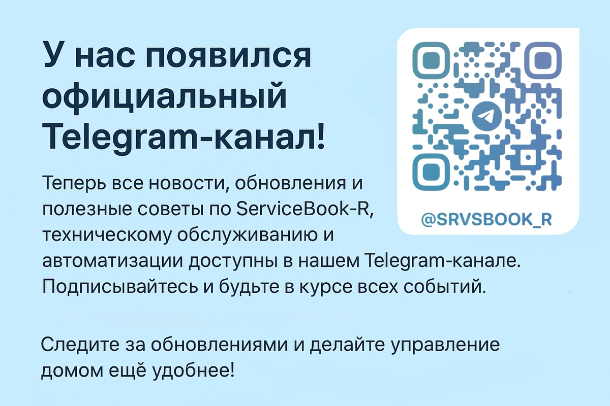 Теперь все новости, обновления и полезные советы по ServiceBook-R, техническому обслуживанию и автоматизации доступны в нашем Telegram-канале. Если кому удобнее следить за обновления в Телеграм, то подписывайтесь и будьте в курсе всех событий: