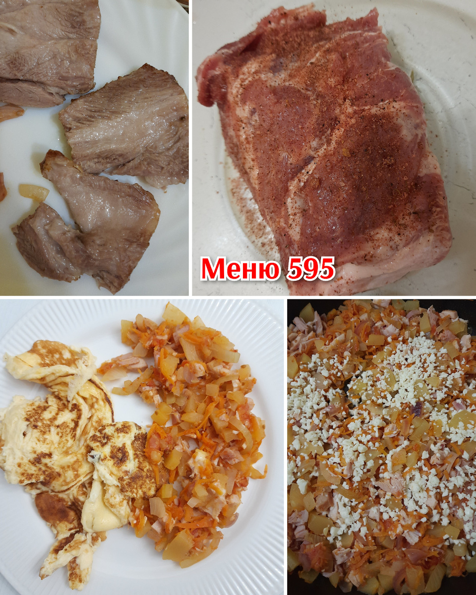 #Обед – буженина из свиной шеи. Она идет обычно в районе 1 кг. Запекала в стеклянной форме с крышкой. Мариновала утром, чтобы к обеду запечь. На этот раз вот такая. Слово мясника, Тамбовская область. На дно формы выкладываю пару лавровых листа и 2 дольки чеснока, нарезанные пластинками. Сверху выкладываю мясо. Прямо в форме смазываю специями. Взяла Кавказскую соль, которую привозила из Сочи. И как бы втираю специи в мясо. В нее входит соль, чеснок сушеный, паприка, пажитник. В духовку при 190 градусах на 1.5 часа. Теперь я даже крышку не открываю, ничего не подрумяниваю. Буженина там тушится. Хотя сверху все равно получается зажаристая часть. Лично мне нравится буженина в теплом виде. Это как мясное блюдо к гарниру. Пока она теплая, жир нежный и сочный. Само мясо неплохое. Жир жующийся и довольно мягкий. Только несколько кусочков попалось чего-то сложно жующегося, что хотелось выплюнуть. #Ужин – соте с копченой курицей и омлет. Новая вариация, потому что базовые продукты с огорода еще