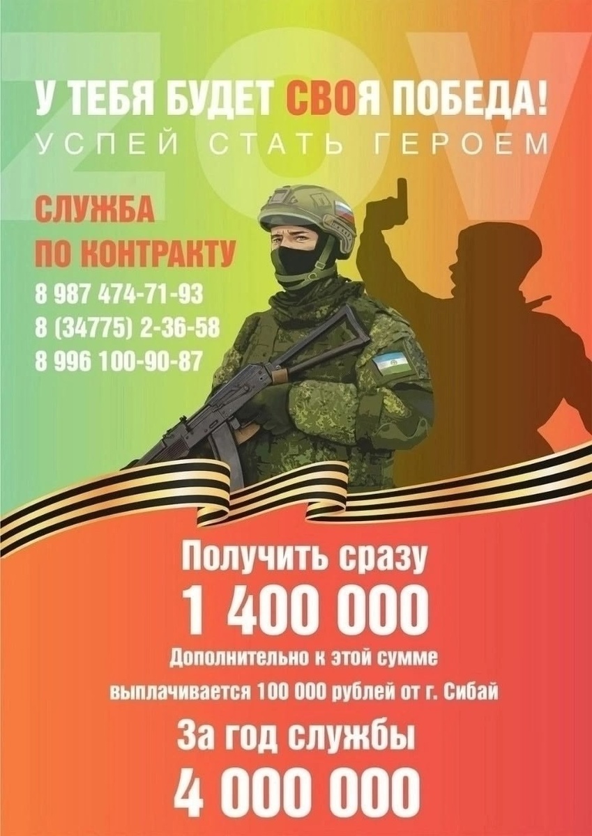 СВОих не бросаем! Получи сразу 1 400 000 руб + 100 000 руб от г. Сибай Для поступления на службу по контракту необходимо обратиться в военкомат по адресу: г. Сибай, ул. Пионерская, 7, тел. 8-987-474-71-93; 8 (34775) 2-36-58; 8-996-100-90-87. #Сибай #СВО
