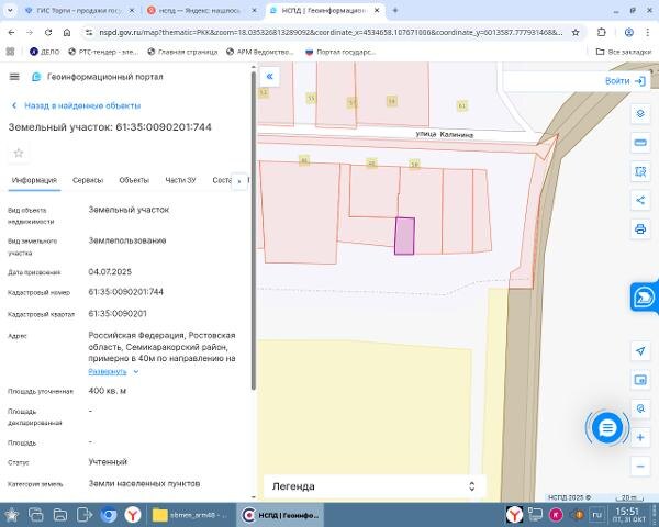 Название: Земельный участок с кадастровым номером 61:35:0090201:744 площадь 400 по адресу Российская Федерация, Ростовская область, Семикаракорский район, примерно в 40м по направлению на юг от строения, расположенного по адресу: х. Костылевка, ул. Калинина, 50 Канал: Госземля Ростовская область Область: обл Ростовская Район: м.р-н Семикаракорский примерно в 40м по направлению на юг от строения Населенный пункт: расположенного по адресу: х. Костылевка, ул. Калинина, 50 Локация: Смотреть на карте ВРИ: Для ведения личного подсобного хозяйства (приусадебный земельный участок) Кадастровый номер: 61:35:0090201:744 Кадастровая стоимость: - Вид сделки: Продажа Площадь: 400 м² Начальная цена: 34891.00 руб. Дата завершения: 18.11.2025 Подробнее: ГИС ТОРГИ #госземля #земляотгосударства #земля #земельныйучасток #земельныеторги #торги #аукцион #продажаземли #продажа #ростовскаяобласть