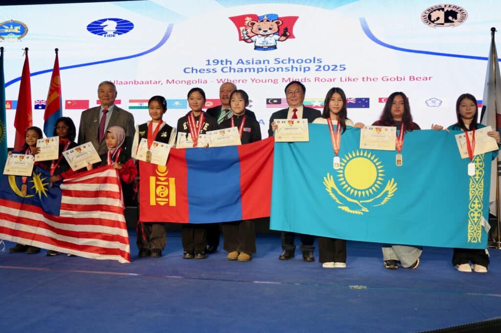 Сборная Казахстана успешно выступила на 19-м чемпионате Азии среди школьников по шахматам Asian Schools Chess Championships 2025, который проходил с 25 октября по 1 ноября в Улан-Баторе. В турнире участвовали 675 юных шахматистов из 16 стран, казахстанская делегация насчитывала 38 спортсменов. Всего казахстанские юниоры завоевали 22 медали: 10 золотых, 7 серебряных и 5 бронзовых. В командном зачете сборная стала лучшей в рапиде, второй — в блице и третьей — в классике. Золотые медалисты Казахстана: Алихан Хажатулы (O15, Жетісу) — 2 золота (классика, блиц) Нурали Нуршин (O9, Астана) — 2 золота (классика, блиц) Малика Джаппарбекова (G15, Астана) — 2 золота (рапид, блиц) Алдияр Жарас (O13, Алматы) — 1 золото (рапид) Нурмухаммед Кабиназар (O15, Алматы) — 1 золото (рапид) Рамазан Тулеген (O11, Алматинская обл.) — 1 золото (рапид) Акерке Молдагали (G13, Астана) — 1 золото (блиц) Соревнования проходили в шести возрастных категориях для юношей и девушек и включали три вида программы: рапид, кл
