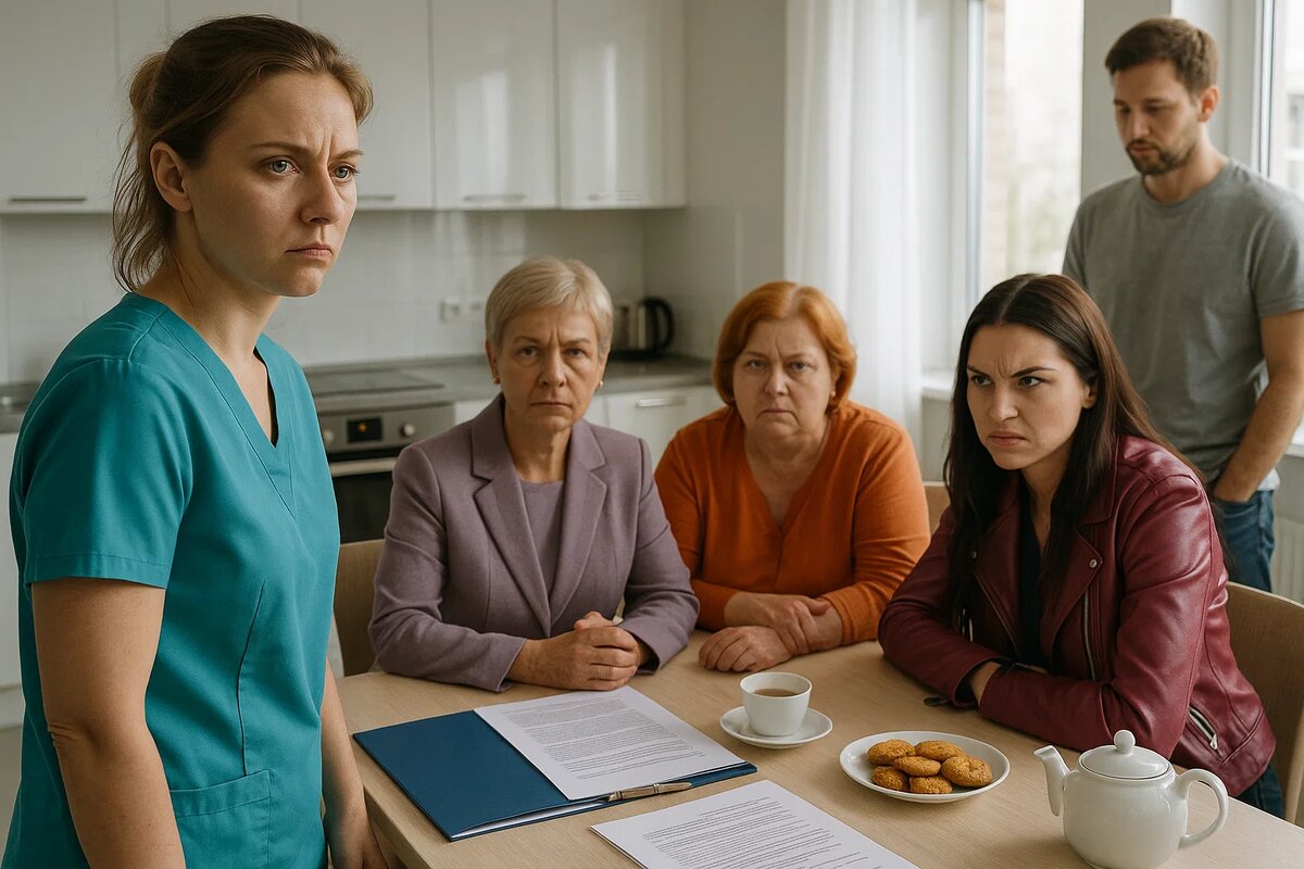 Они пришли минута в минуту. Свекровь — в жакете, с папкой документов. Её сестра — полная, с крашеными волосами. Золовка Кристина — в кожаной куртке, смотрела на меня сверху вниз.