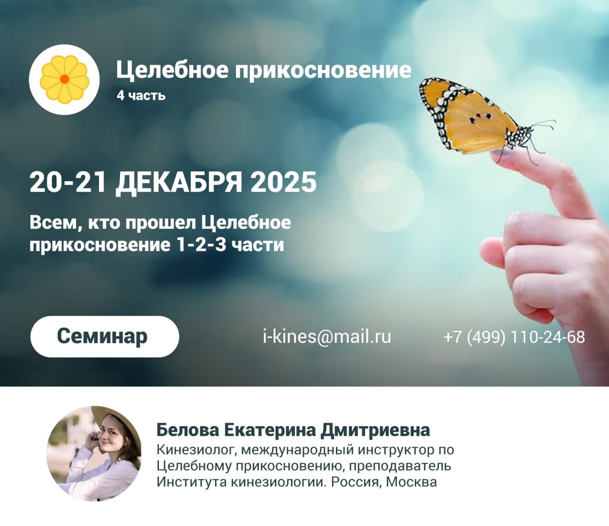 Дорогие друзья!🌿 Приглашаем Вас на семинар "Целебное прикосновение — 4", который будет проведен с 20 по 21 декабря 2025 года. Семинар проведет Белова Екатерина Дмитриевна — кинезиолог, международный инструктор ЦП, преподаватель Института кинезиологии 💫 Вы сможете провести полный баланс 42 мышц тела, добавите в балансировку эмоциональную коррекцию, работу с цветом и звуком по системе Пяти Элементов (У-син) А также изучите следующие темы: 🔘 Теория акупрессурных точек 🔘 Точки Ло 🔘 Баланс по времени дня 🔘 Баланс энергии «восьмёрки» 🔘 Нефролимфатическое освобождение 🔘 Анализ осанки, высвобождение стресса от напряжённой осанки 🔘 Цели и эмоции Подробнее можно узнать в личных сообщениях группы ВК или по ссылке — https://i-kines.ru/czelebnoe-prikosnovenie-4/