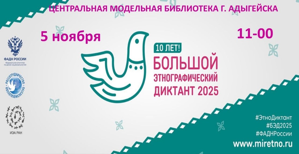 5 ноября 2025г в Центральной модельной библиотеке в 11-00ч состоится Всероссийская просветительская акция "Большой этнографический диктант". Юбилейная акция направлена на укрепление общероссийской гражданской идентичности, популяризацию традиционных российских духовно-нравственных ценностей и борьбу с фальсификацией истории. Приглашаем всех желающих принять участие в акции! #Адыгея #Адыгейск