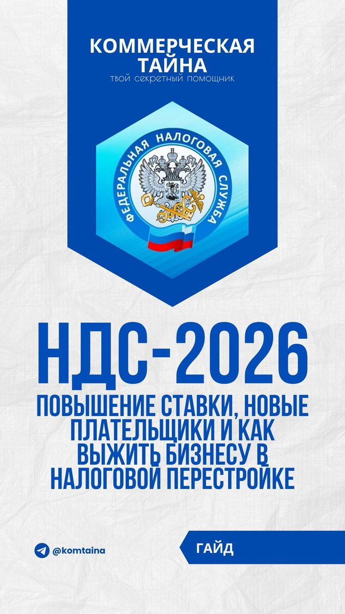 ⚡️ НДС-2026: повышение ставки, новые плательщики и как выжить бизнесу в налоговой перестройке Реформа, запущенная в 2024 году, выходит на ключевой этап — изменения по налогу на добавленную стоимость. С 1 января 2026 года бизнес ждёт не просто повышение ставки, а фактический пересмотр всей системы НДС-обложения. 💬 Что изменится и как к этому подготовиться — разберём подробно. 👉 Benefitsar НДС — проверенные вычеты, сопровождение, защита от рисков. Переходите за консультацией специалистов: @supernewna_bot @komtaina