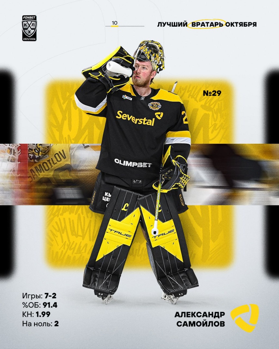 🟡 Александр Самойлов стал ключевой фигурой в 8-матчевой победной серии «Северстали» и во второй раз в карьере был признан лучшим вратарем месяца в КХЛ.
